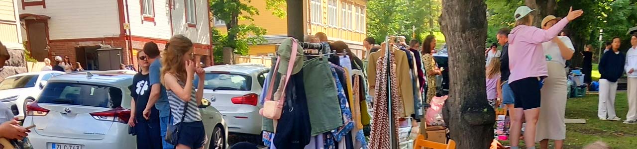 Noudan voittoni ja aloitan kierrokseni Puutarhakatu 46 paikkeilta. Kirppistunnelmaa ei tarvitse etsiä. Kadun reunoille ja nurmialueille on levitetty isoja pressuja, joiden päältä löytyy moninainen tavaroiden kirjo astioista viherkasveihin, vaatteista ja kengistä kirjoihin, lasiesineistä leluihin. Täällä myyntiä tehdään koko perheen voimin. Jutustellaan, vaihdetaan kuulumisia, viihdytään. Nähdään ja tullaan nähdyiksi.