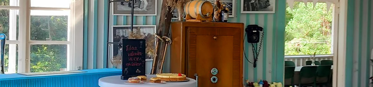 Huomio kiinnittyy tilassa olevaan pieneen kakkupöytään ja kylttiin "Tilaa väliaikaherkku etukäteen!" Paviljonki toimii yhteistyössä kesäteatterin ja tanssilavan kanssa. Väliaikatarjoilut ja myytävät ruokatuotteet ovat Paviljongin heiniä, samoin esim. ennen teatteriesityksiä asiakkaiden tilaamat lounaat tai muut ruokailut.